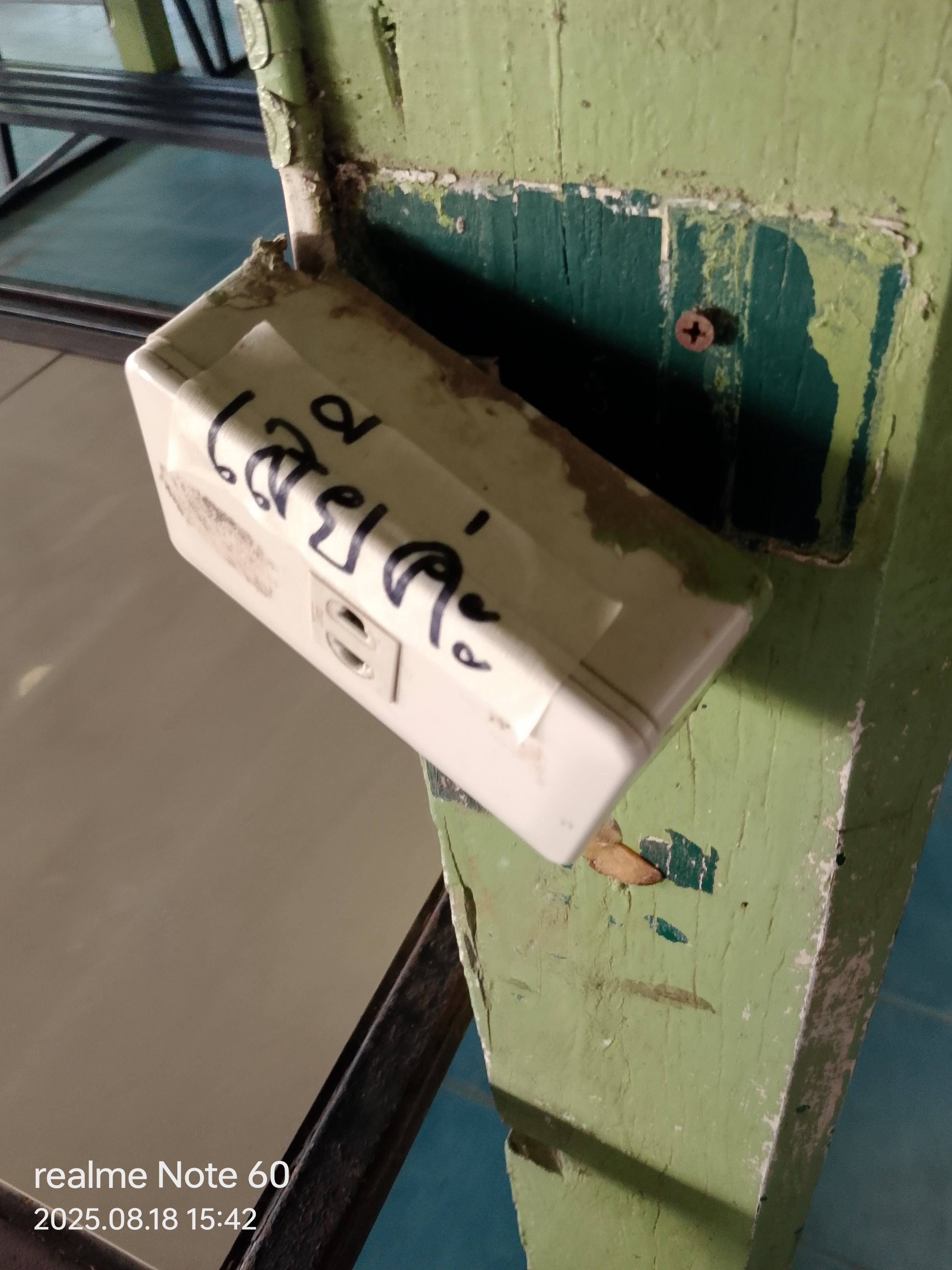 | 18/08/2025 15:58 | อื่นๆ | ระบบไฟฟ้า มันหลุดออกมา ดูรูปภาพ | ด.ช. ชวกร วัยวุฒิ (นักเรียน) | แจ้งแล้ว |